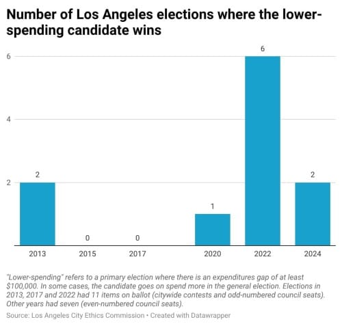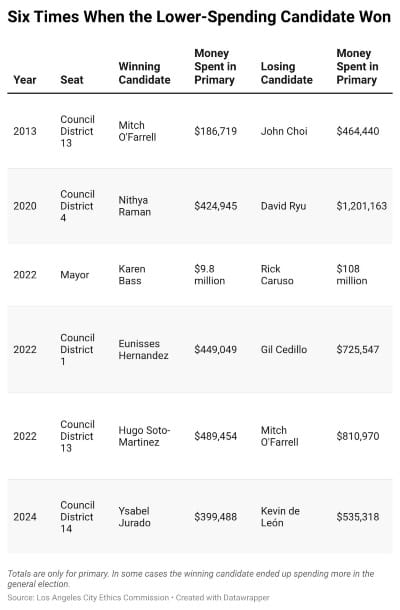 I’ve been covering L.A. city elections for a couple of decades, and while the better-funded figure wins more often than not, I’ve tracked numerous instances where the opposite happens. The most notable example occurred in 2022, when billionaire developer Rick Caruso’s campaign spent an astonishing $109 million in his bid for mayor, while Karen Bass’ campaign shelled out about $9.8 million. The 11:1 discrepancy didn’t matter — she won the November runoff by 10%, or about 90,000 votes.