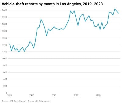In a November 2023 story for Crosstown, I wrote about soaring car thefts in Los Angeles and the neighborhoods victimized most frequently. Crosstown is a nonprofit news organization based out of the USC Annenberg School of Communication and Journalism that mines publicly available data to produce original stories. Using data from the Los Angeles Police Department, I identified spiking counts in downtown L.A. (1,305), Westlake (662) and so on.